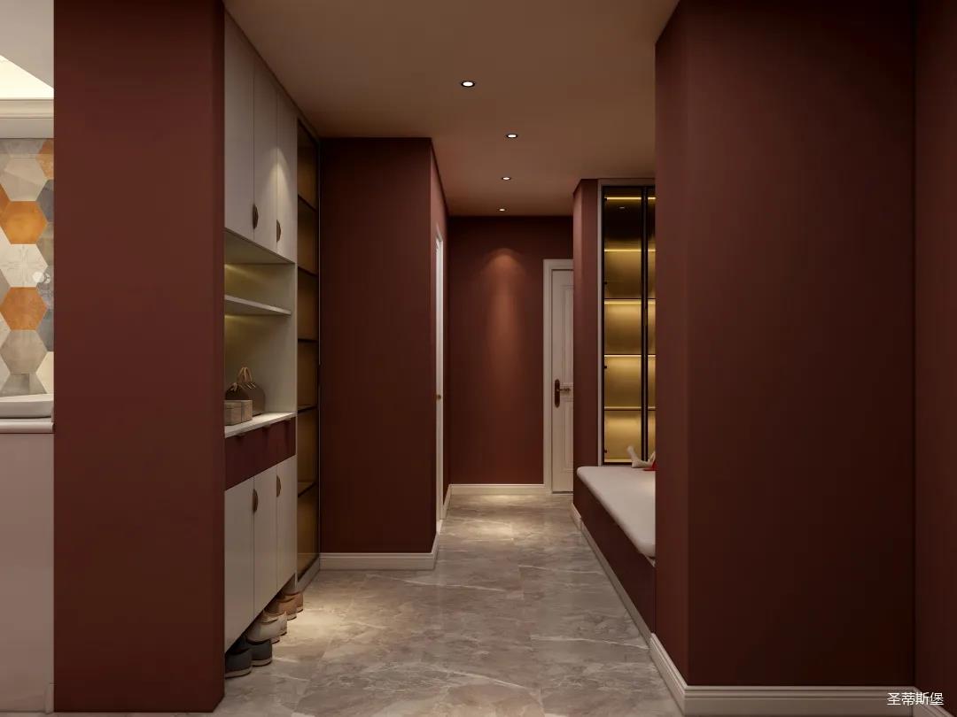 表姐不喜欢大白墙设计,于是设计师完美贴合表姐的喜好,摒弃了传统的大白墙,将色彩跳跃的铁锈红应用于空间,从视觉上丰富了空间的层次感。南北通透的空间布局,让视野更为清透明亮。