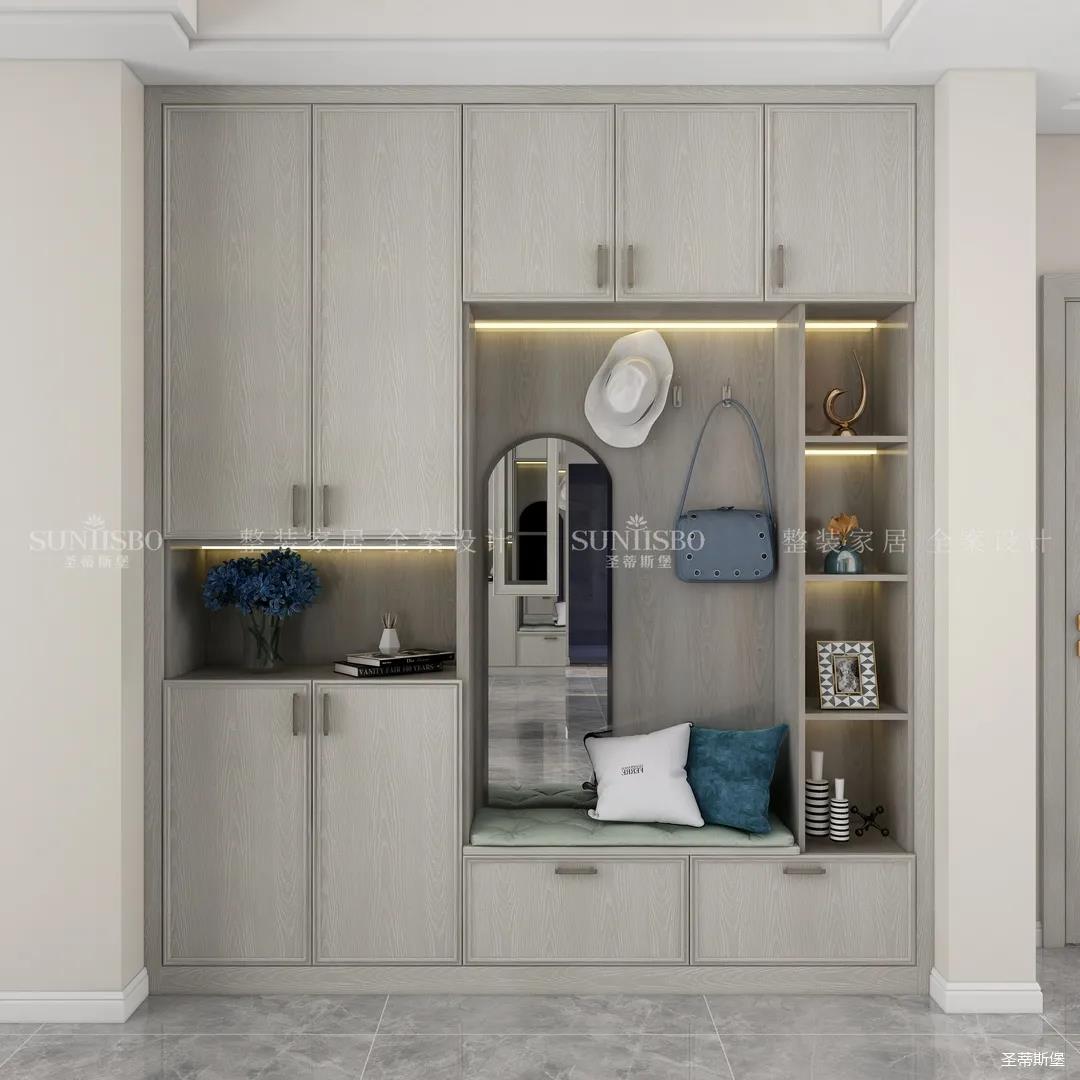 衣帽间是女主特别要求的,设计是将房间打造成衣帽间系统,采用L型布局,壁挂式设计,让穿搭动线更顺畅,视觉上也更通透,可直观的展示女主人穿搭品味。玻璃层板与背板花色的结合,精致灵动,成为时尚与轻奢的写照,封闭区衣柜的合理格局规划,完美诠释现代轻奢风于当代定制中的前瞻性。